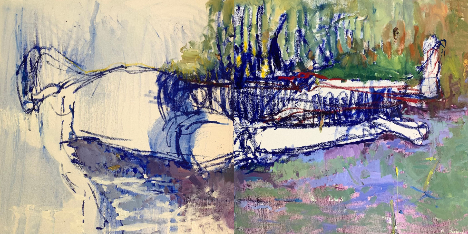 The works begin with a recognisable art-historical template: the reclining nude. The citation is intentional. It activates the memory of Renaissance and classical painting, where the nude often functions as an image to be looked at idealised, finished, and contained. Here, that economy of looking is interrupted. The figure is held in a raw contour, traced rather than modelled, and the body remains unfilled white, withheld, unresolved. What is traditionally offered as flesh becomes a void. The gesture is not erasure but refusal: the subject is visible, yet not available.